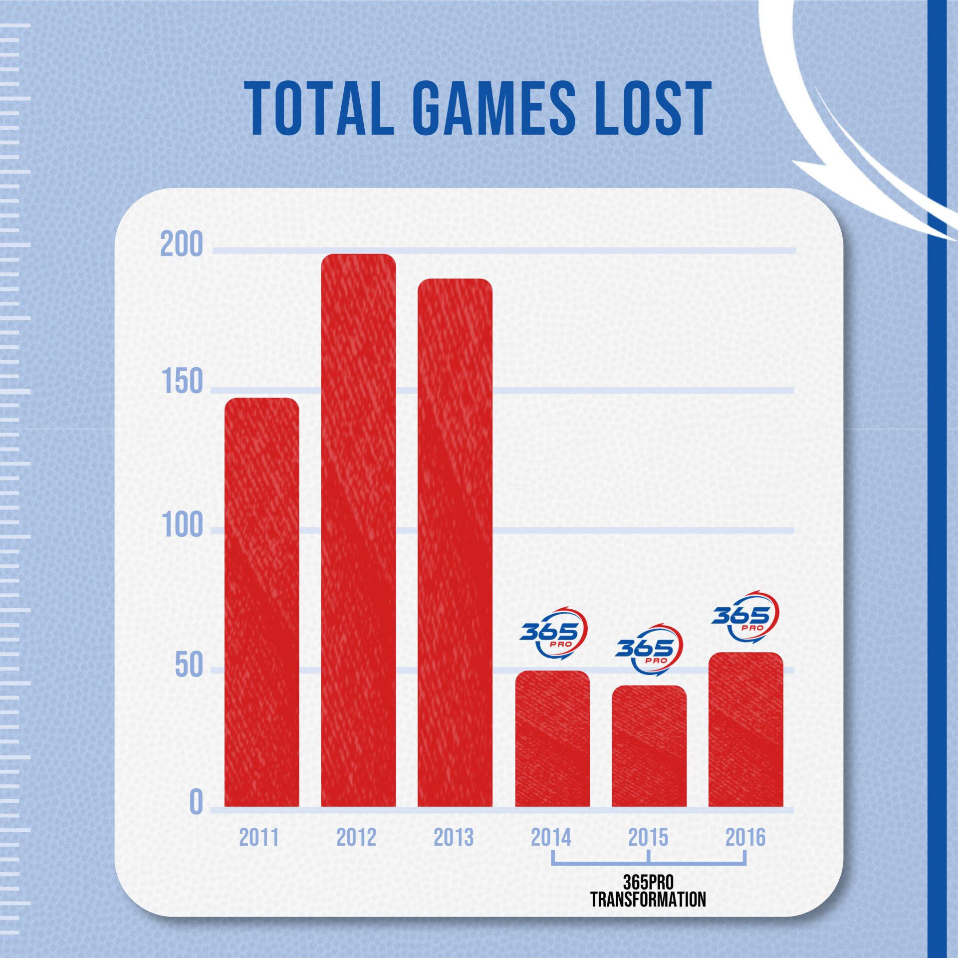This graph represents how many starters were lost per game on average for the entire year. Implementing the 365Pro Program significantly decreased the starters lost per game between Pre365 and the 365Pro Transformation.