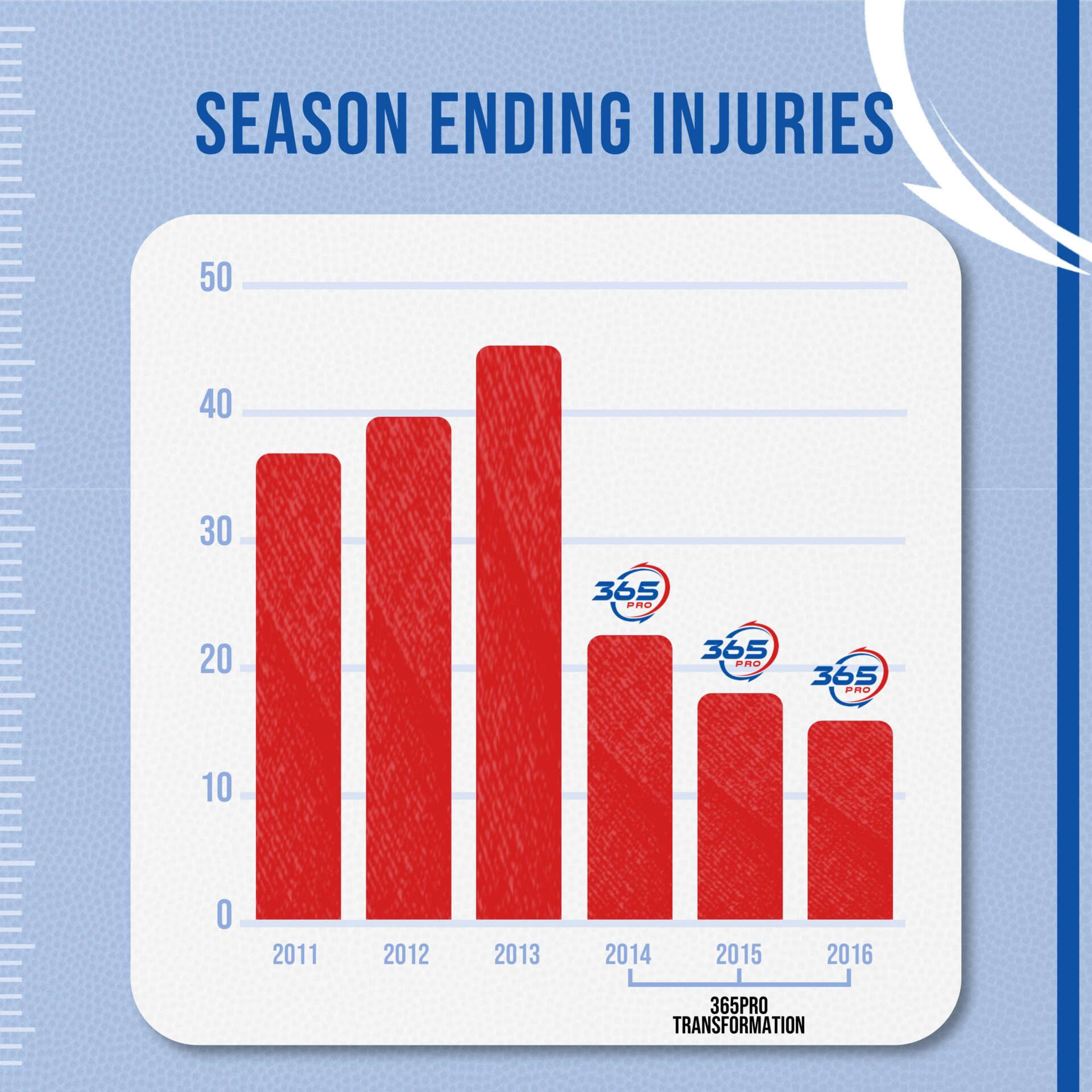 The 365Pro Transformation was proven to offer collegiate football players participating at the NCAA Division 1 level benefits such as fewer serious injuries, fewer missed games, and more potential time on the field.*