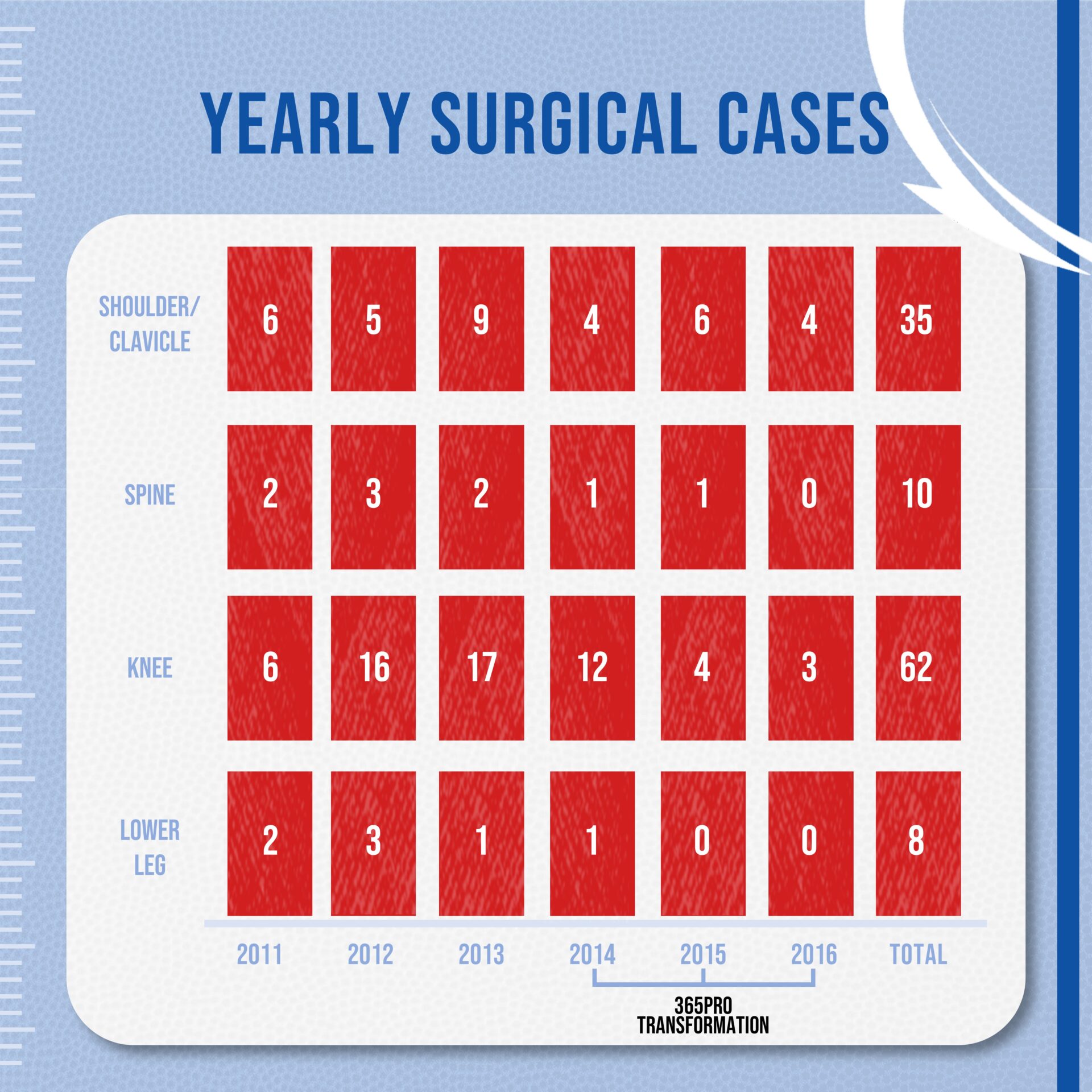 This graph represents surgical cases for the entire calendar year. This includes off-season, weight-training, spring football, camp, and in-season. The data includes joints and soft tissue injuries that are typical for the game of football.